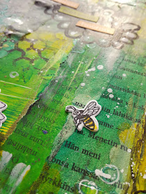 Taustalla revittyjä gelliprinttejä ja karyylimaaleja. Päällä Piia Paper co:lta Craftaamossa hankitulla leimasimella tehtyjä päivänkakkaroita, mehiläisiä ja leppäkerttuja.